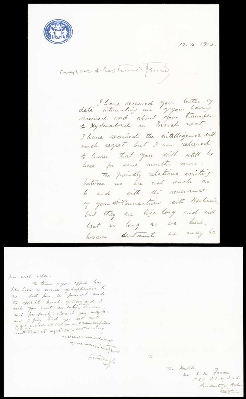 1913 (12 October) secretarial letter from the Maharaja of Jammu and Kashmir on the palace letterhead. The letter notes with regret Sir Stuart's pending transfer to Hyderabad. "My dear & Esteemed Friend" and concludes in the hand of the Maharaja and sent when Sir Stuart Fraser was the Resident in Kashmir. Photo