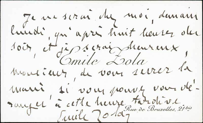 Translations of the notes, "My dear colleague, I will happily receive you on whatever day you like, at 6 o'clock, Sunday excepted. Cordially, Émile Zola" and "I shall only be home tomorrow, Monday, after 8 in the evening, and will be pleased, sir, to shake your hand if you can step out at such a late hour. Émile Zola".