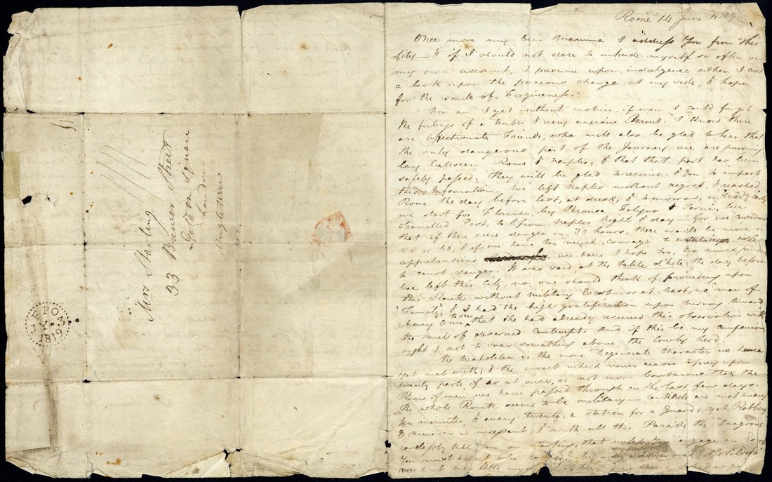 1819 (14 June) a long entire letter from P.T. Lemaitre in Rome to Mrs Starling in Golden Square in London. A long and detailed letter relates to his travels between Naples and Rome with graphic details of the dangers of robbery and murder. On route, they visited Mount Vesuvius where the current of lava was flowing within a yard of their feet. With typed transcription. Rated at "1/11" the cover bears a fine strike of "FPO" arrival c.d.s. (3.7). Creased and soiled, nevertheless a very interesting letter
