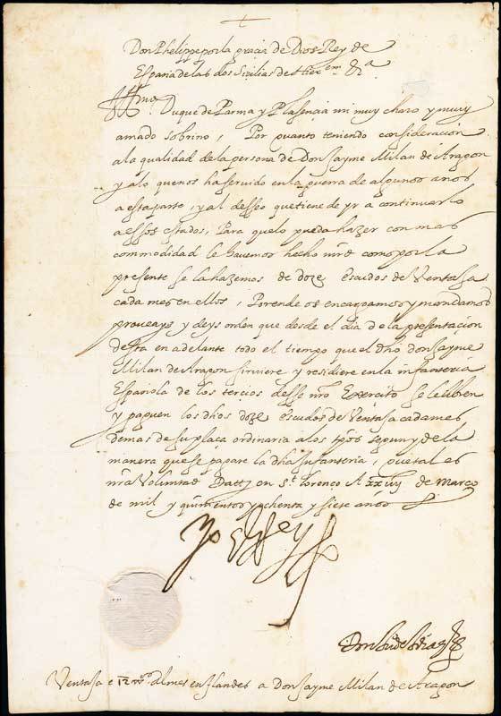 1584 (20 March) letter from St. Lorenco to the Duke of Parma with general contents with regard to the army in Flanders. Signed at foot "yo el Rey" (I King) and with secretary signature below. Usual creasing and wafer seal at foot. Photo
