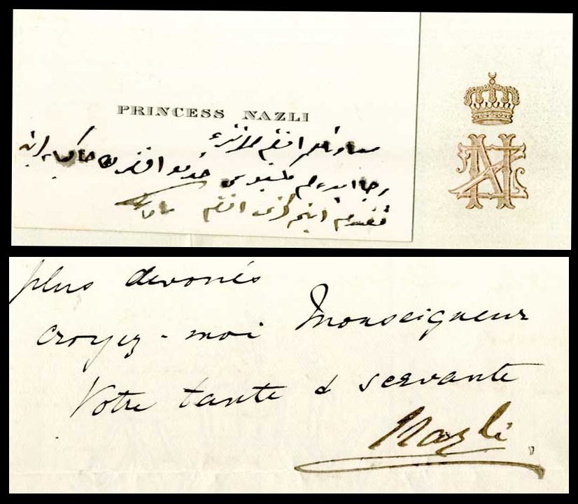 Undated letter to "Son Altesse le Khedise", hand delivered autograph letter on her personal notepaper, written in French and signed "Nazli"; included is her card with arabic note and the matching envelope. Fine. Photo