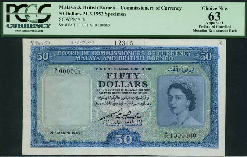 Board of Commissioners of Currency, Malaya and British Borneo, specimen $50, 21 March 1953, serial number A/1 000001-A/10 100000, blue and pale green and lilac, Elizabeth II at right, value low centre and at top left and right, W.C.Taylor signature low centre, reverse blue and white, arms of the Federated States in field, value at left and top left and right, perforated SPECIMEN