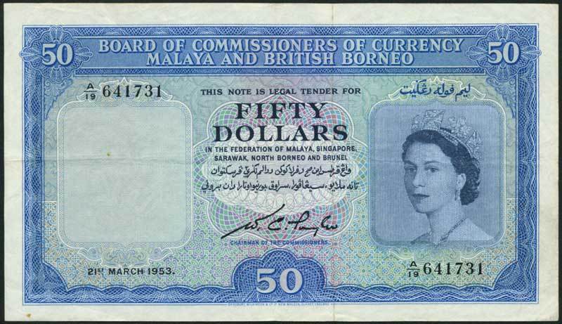 Board of Commissioners of Currency, Malaya and British Borneo, $50, 21 March 1953, serial number A/19 641371, blue and multicoloured, Elizabeth II at right, value at centre, Taylor signature low centre, reverse blue and white, arms and value in field