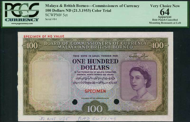 Board of Commissioners of Currency, Malaya and British Borneo, colour trial $100, ND (1953), green and lilac and pale blue, Elizabeth II at right, value low centre and at top left and right, reverse green and white, arms of the Federated States in field, value at left and top left and right, two cancellation holes