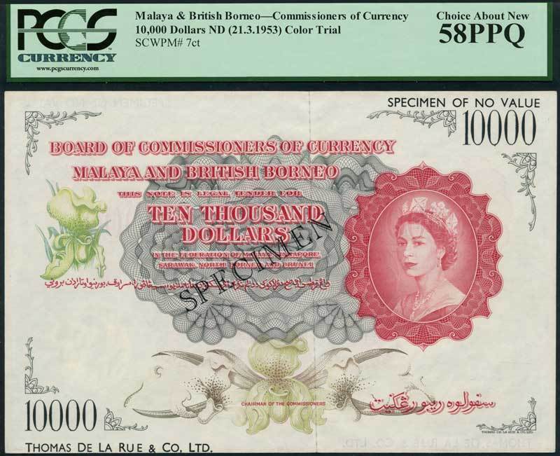 Board of Commissioners of Currency, Malaya and British Borneo, colour trial $10000, ND (1953), no serial numbers, red and multicoloured, value in grey guilloche left centre, Elizabeth II at right, orchids in field, value low left and top right, reverse pale red, arms of the Federated States at centre, value at left and right, black THOMAS DE LA RUE overstamp and SPECIMEN OF NO VALUE low left and top right