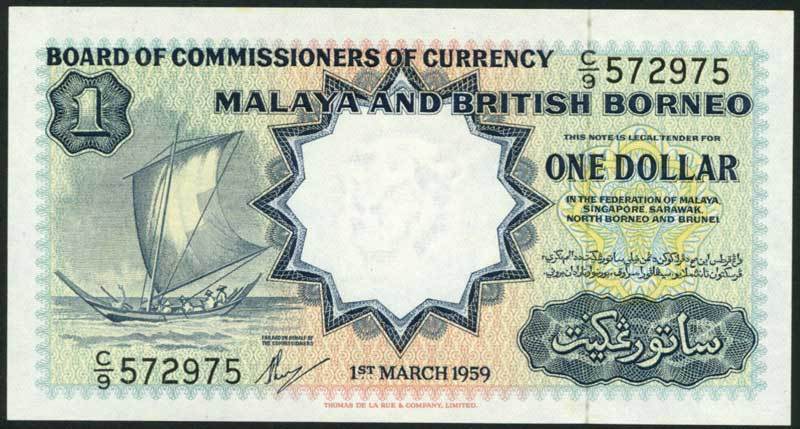 Board of Commissioners of Currency, Malaya and British Borneo, $1, 1 March 1959, serial number C/9 572975, pale blue, pale red and green and white, sailboat at left, value at left and right, Tun Lee Hau Shik signature, reverse red and white, arms