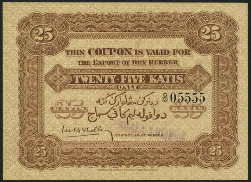 Rubber Export Coupons, British Malaya, 25 katis (2), ND (1928-1934), dark and pale brown, purple overstamp KUALA LUMPUR/ULU SELANGOR