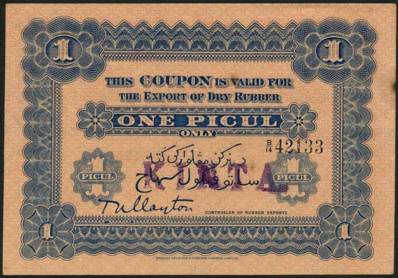 Rubber Export Coupons, British Malaya, 1 picul, ND (1928-1934), blue and pink-brown, purple KINTA overstamp, 10 katis, brown and pale green, purple KUALA LUMPUR overprint, 10 katis, brown and pale green, ULU SELANGOR overstamp