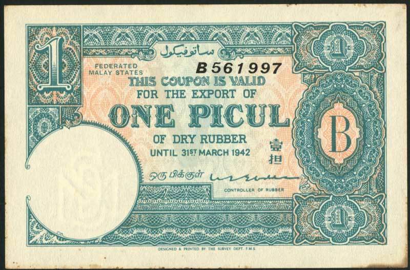 Rubber Export Coupons, Federated Malay States, 5 katis, 1936, 10 katis, 1941, both pink and brown, 25 katis (2), 1941, blue-green, 1 picul (2), 1941,1942, one blue, one green and 5 piculs, 1941,lilac,
