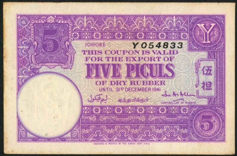 Rubber Export Coupons, Johore, 25 katis, 1941, blue-green, 1 picul, 1941, blue, 5 piculs, 1941, lilac, 10 katis, 1941, brown, 1941