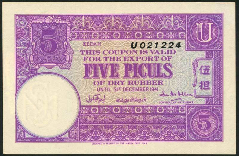 Rubber Export Coupons, Kedah, 25 katis, 1941, blue-green, 10 katis, 1941, pink-brown, 1 picul, 1941, blue, 5 piculs, 1941, lilac