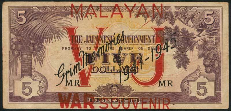 Propaganda issue, Malaya, 5 dollars, 'War Souvenir' issue, purple with black 'Grim memories of 1941-1945 at centre