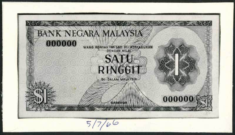 Bank Negara Malaysia, obverse printers archival photographs for 1 ringgit, ND (1966), black and white, value at right and low left and right, also two sheets of proposed logos for Bank Negara Malaysia