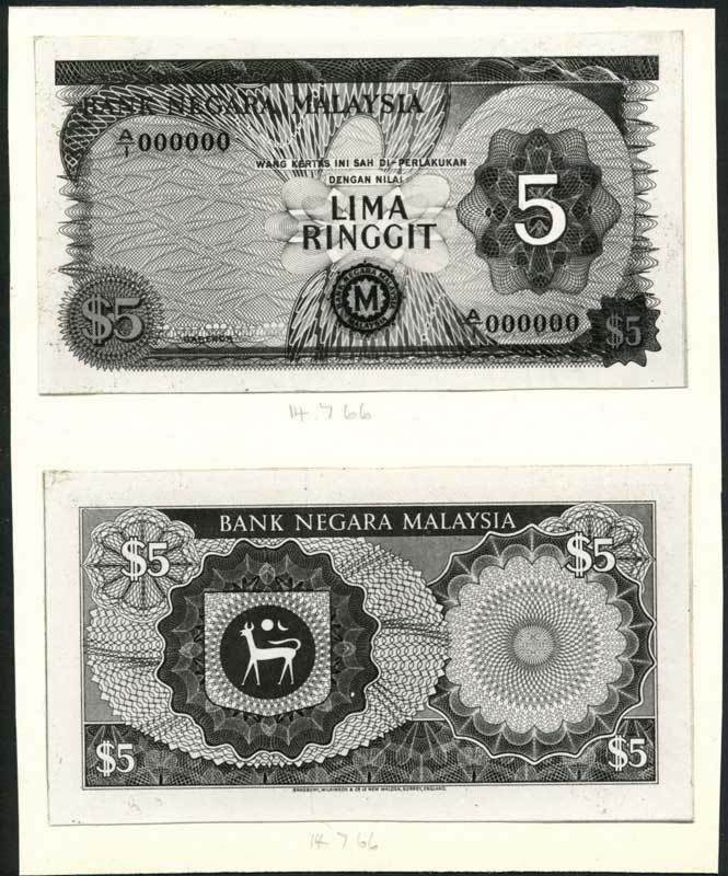 Bank Negara Malaysia, obverse and reverse printers archival photograph for 5 ringgit, ND (1966), black and white, value at right and low left and right, reverse with arms at left