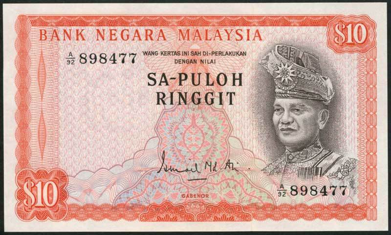 Bank Negara Malaysia, 5 ringgit, ND (1967-), prefix A/15, green and 10 ringgit (2), prefixes A/92 and B/70, red, all Tuanku Abdul Rahman at right, Ismail Ali signature