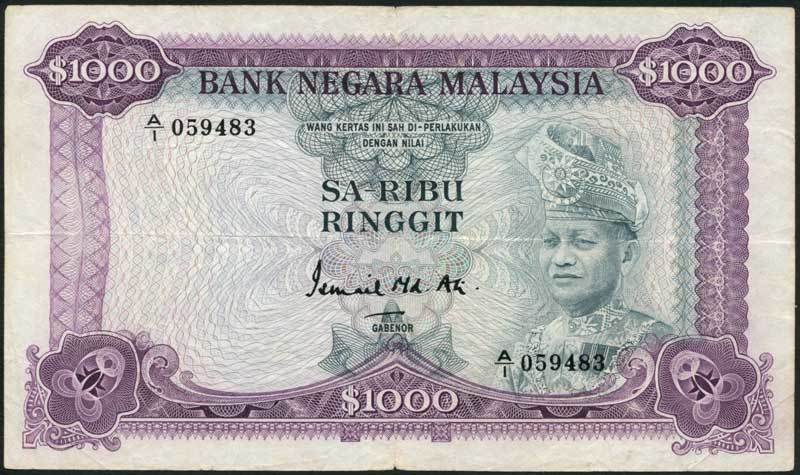 Bank Negara Malaysia, 1000 ringgit, ND (1967-), serial number A/1 059483, purple and pale blue-grey, Tuanku Abdul Rahman at right, Ismail Ali signature