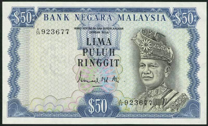 Bank Negara Malaysia, 1 ringgit, ND (1967-), prefix A/53, blue and 50 ringgit, prefix A/59, blue, all ND (1972-), both Tuanku Abdul Rahman at right, Ismail Ali signature