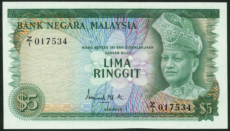 Bank Negara Malaysia, 5 ringgit, ND (1967-), serial number Z/1 017534, green, Tuanku Abdul Rahman at right, Ismail Ali signature