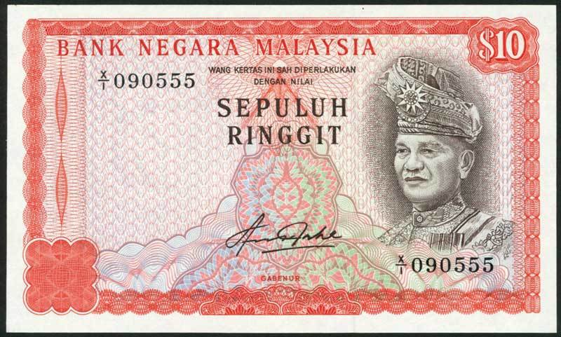 Bank Negara, Malaysia, 10 ringgit, ND (1981), serial number X/1 090555, red and multicoloured, Tuanku Abdul Rahman at right, Governor Taha signature