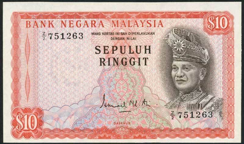 Bank Negara Malaysia, 10 ringgit, ND (1967-), serial number Z/2 751263, red, Tuanku Abdul Rahman at right, Ismail Ali signature
