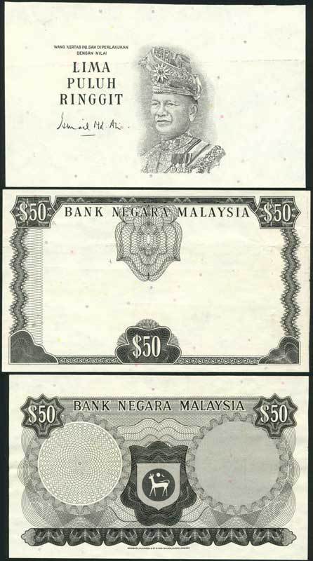 Bank Negara Malaysia, an obverse partial die proof for a 50 ringgit of the second issue, ND (1972-), black and white , Tuanku Abdul Rahman at right, also another partial die proof without portrait for the 50 ringgit and a die proof reverse for a 50 ringgit