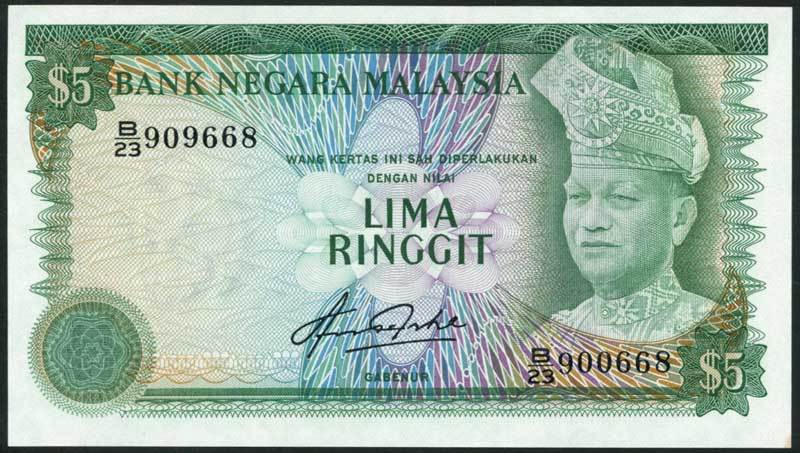 Bank Negara Malaysia, 5 ringgit, ND (1976), serial number B/23 909465-900465, green and blue and lilac, Tuanku Abdul Rahman at right, signature of Abdul Aziz bin Taha low centre, reverse green, arms at centre, value at left and at each corner
