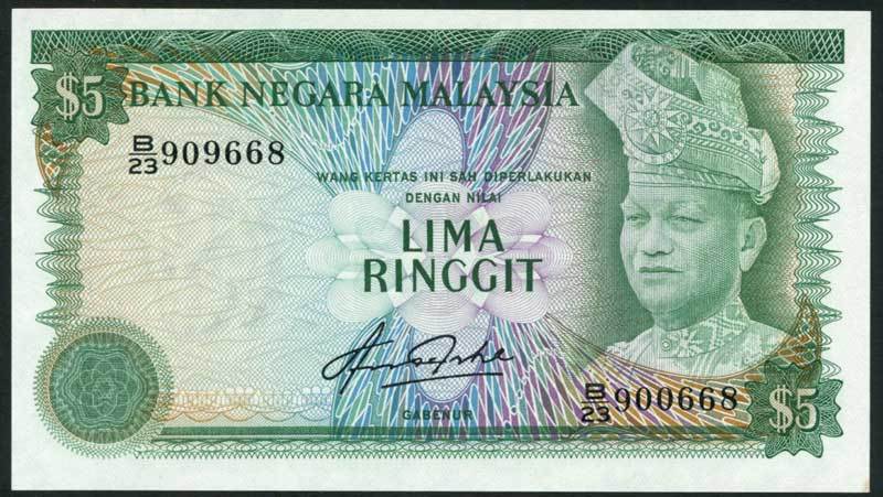 Bank Negara Malaysia, 5 ringgit, ND (1981), serial number B/23 909668-900668, green and blue and lilac, Tuanku Abdul Rahman at right, signature of Abdul Aziz bin Taha low centre, reverse green, arms at centre, value at left and at each corner