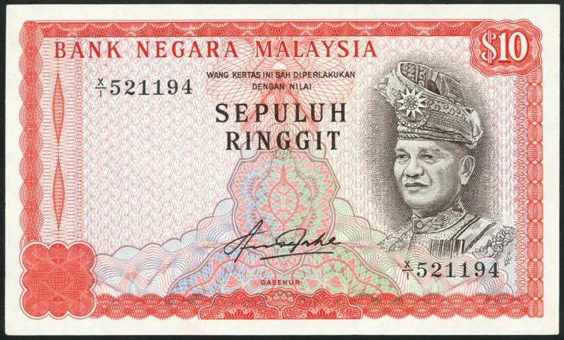 Bank Negara Malaysia, 10 ringgit, ND (1981-), serial number X/1 521194, red, Tuanku Abdul Rahman at right, Abdul Aziz bin Taha signature