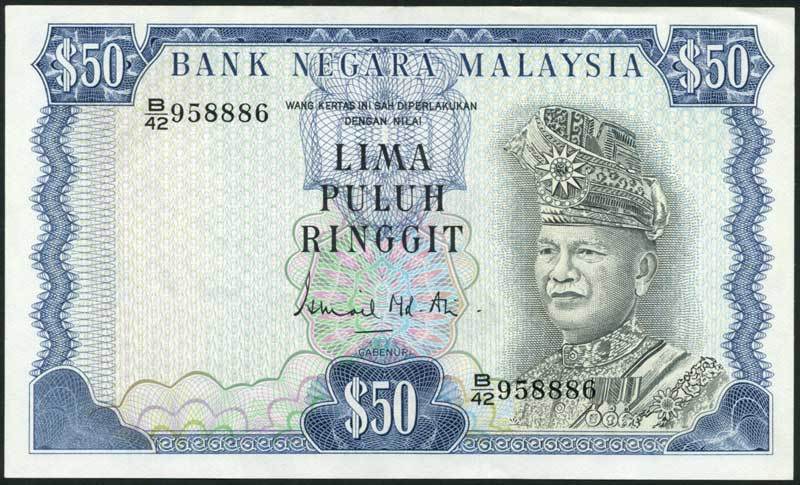 Bank Negara Malaysia, 50 ringgit (2), 1976 issue, consecutive serial numbers B/42 958886-887, blue, Rahman with Tnegkolok headgear at right, reverse grey, bank logo, printed by Bradbury Wilkinson