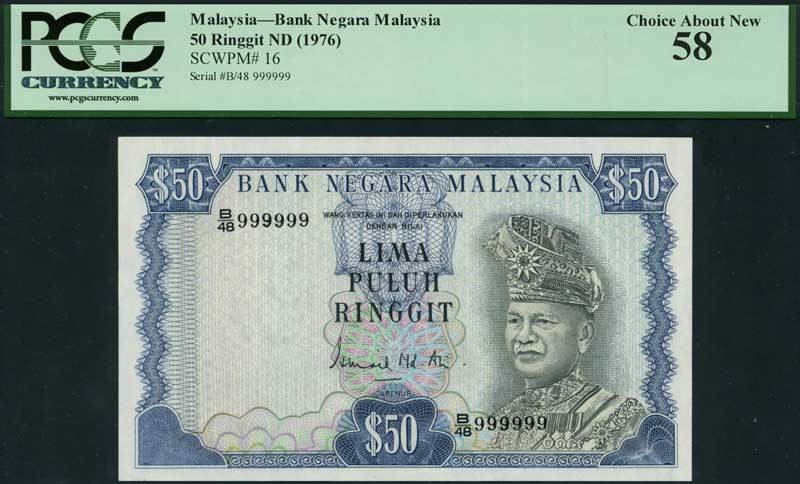 Bank Negara Malaysia, 50 ringgit, ND (1976), serial number B/48 999999, blue and green and pink, Tuanku Abdul Rahman at right, signature of Ismail Ali low centre, reverse blue, arms at centre, value at top left and right