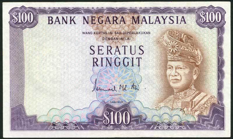 Bank Negara Malaysia, 100 ringgit, ND (1976), no serial numbers, purple and multicoloured, Tuanku Abdul Rahman at right, signature of Ismail Ali low centre, reverse purple, arms at centre, value at top left and right