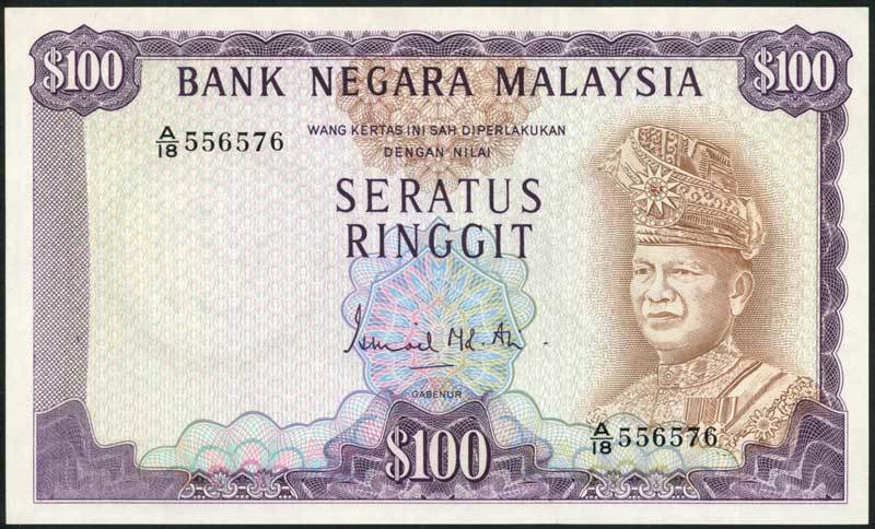 Bank Negara Malaysia, 100 ringgit, ND (1976-), serial number A/18 556576, purple, Tuanku Abdul Rahman at right, Ismail Ali signature
