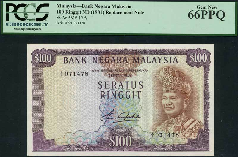 Bank Negara Malaysia, 100 ringgit, ND (1981-), serial number X/1 071478, purple, Tuanku Abdul Rahman at right, Abdul Aziz bin Taha signature