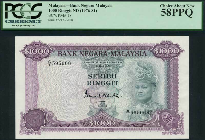 Bank Negara Malaysia, 1000 ringgit, ND (1976-), serial number A/1 595068, purple, Tuanku Abdul Rahman at right, Ismail Ali signature