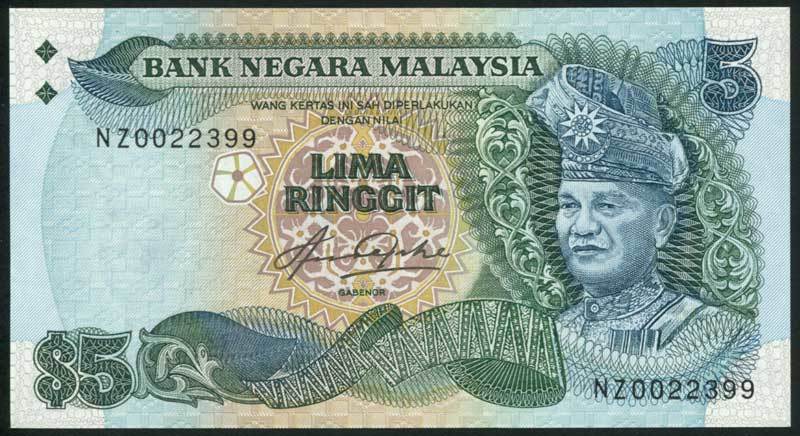 Bank Negara Malaysia, 1 ringgit, ND (1982-), prefix BA, blue, and 5 ringgit, prefix NZ, green, both Tuanku Abdul Rahman at right, Abdul Aziz bin Taha signature