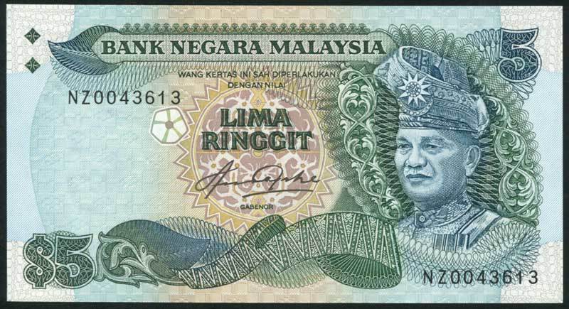 Bank Negara Malaysia, 5 ringgit, ND (1981-), serial number NZ 0043613, blue-green, Tuanku Abdul Rahman at right, Abdul Aziz bin Taha signature