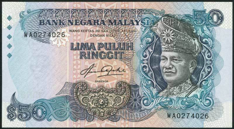 Bank Negara Malaysia, 50 ringgit, ND (1981-), serial number WA 0274026, blue-grey, Tuanku Abdul Rahman at right, Abdul Aziz bin Taha signature