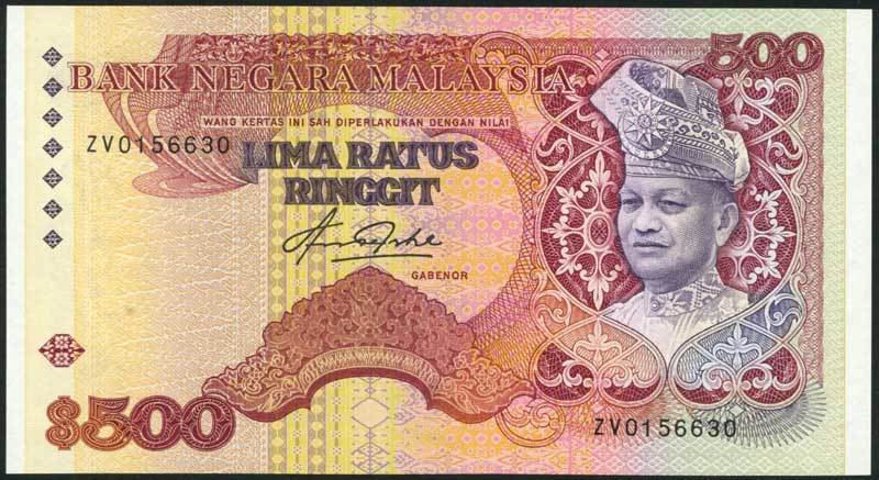 Bank Negara Malaysia, 500 ringgit, ND (1982-), serial number ZV 0156630, purple, orange and red, Tuanku Abdul Rahman at right, Abdul Aziz bin Taha signature