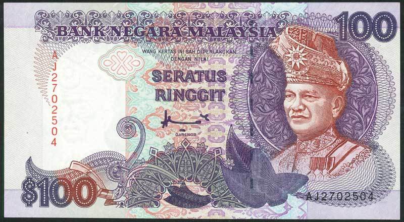 Bank Negara Malaysia, 100 ringgit, 1986-1995 series, serial number AJ2702504, red-brown and violet, Rahman wearing Tengkolok headgear at right, Masjid Negara on reverse, error printing such that the details are shifted towards the right