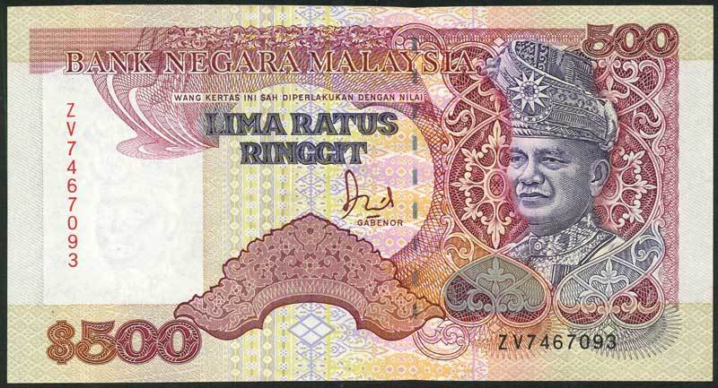 Bank Negara Malaysia, 500 ringgit, ND (1989-), serial number ZV 7467093, purple, orange and dark red, Tuanku Abdul Rahman at right, Jaffar bin Hussein signature