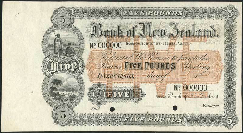 Bank of New Zealand, Invercargill, specimen £5, 18-, zero serial numbers, dark grey and light tan, bank title top centre, ornate column at left with maoris and kiwi birds in circular frames, value in border and in tablet at centre, reverse, mirror image of tablet at centre on obverse