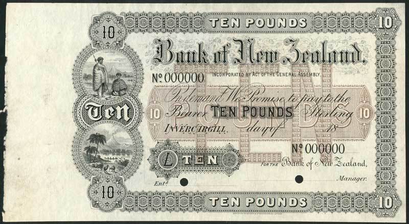 Bank of New Zealand, Invercargill, specimen £10, 18--, zero serial number, grey and very light tan, bank title top centre, elaborate panel at left with maoris and kiwi birds in circular frames, value in ornate border and at tablet in centre