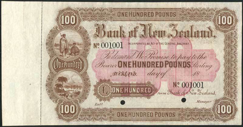 Bank of New Zealand, Auckland, £100, 18--, serial number 001001, brown and light pink, ornate border, panel at left with maoris and kiwi birds in circular panels, bank title top centre, value in border and in tablet at centre