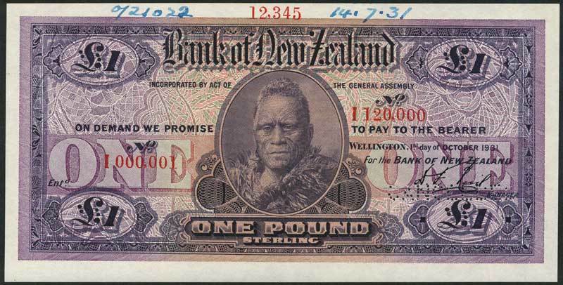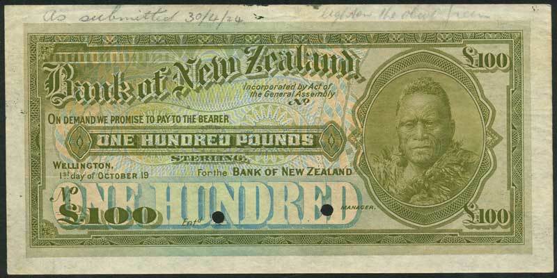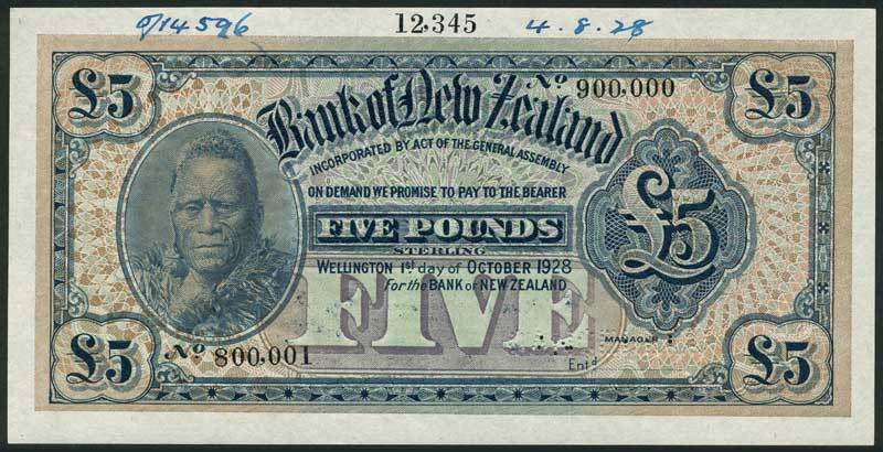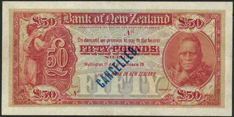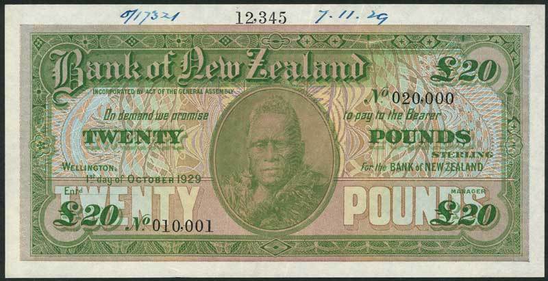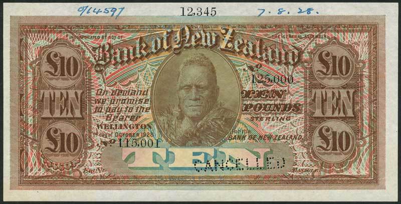Bank of New Zealand, a full specimen set of the 1924-1929 issues, 10 shillings, 1 October 1931, serial range C032,001 - D122,000, orange, £1, 1 October 1931, serial range I000,001 - I120,000, purple, £5, 1 October 1928, serial range 8000,001 - 900,000, grey-blue, £10,1 October 1928, serial range 115,001 - 125,000, brown, £20, October 1929, serial range 010,000 - 020,000, green, £50, 1 October 19--, no serial number, red, £100, 1 October 19--, no serial number, olive green, all featuring portrait Maori King Tawhiao