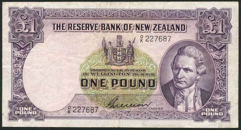 Reserve Bank of New Zealand £1, ND (1957), serial number O/K 227687, violet and green, Captain Cook at right, arms top centre, Wilson signature low right centre