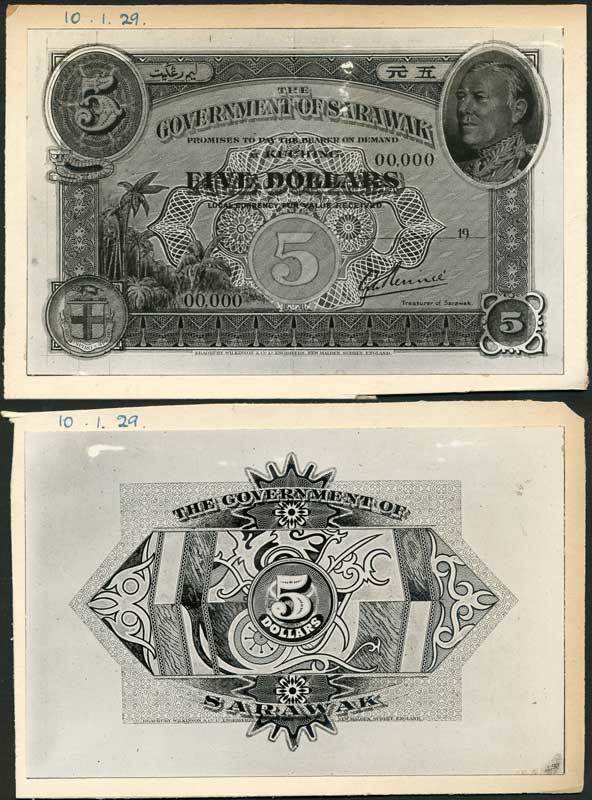 Government of Sarawak, obverse and reverse printers archival photographs showing designs for $5, 19- black and white, Charles Vyner Brooke at right, palm trees at left, arms at low left, reverse value at centre