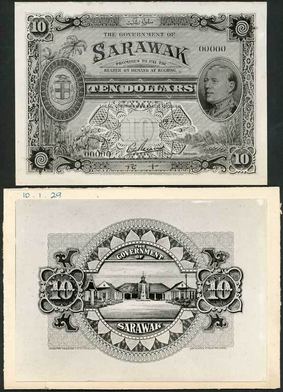 Government of Sarawak, obverse and reverse printers archival photographs showing designs for $10, 19- black and white, Charles Vyner Brooke at right, palm trees at left, arms at left, reverse Old Courthouse at Kuching at centre