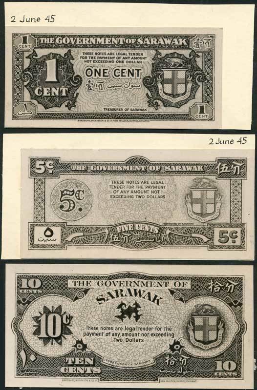 Government of Sarawak, obverse printers archival photographs of 1 cent, 5 cents and 10 cents, ND (1945), black and white, all with arms at right, value at left and in corners