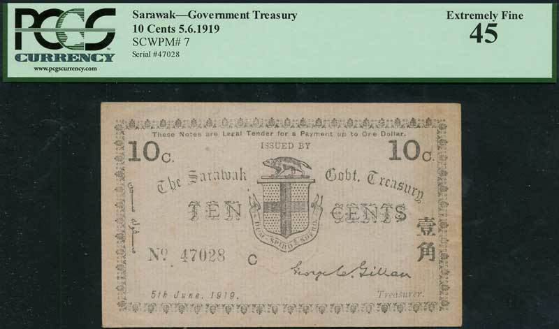Government of Sarawak, 10 cents, 5 June 1916, serial number 47028, black text on grey card like paper, arms top centre, value top left and right, Gillan signature, reverse black on grey, arms at centre, value at left and right
