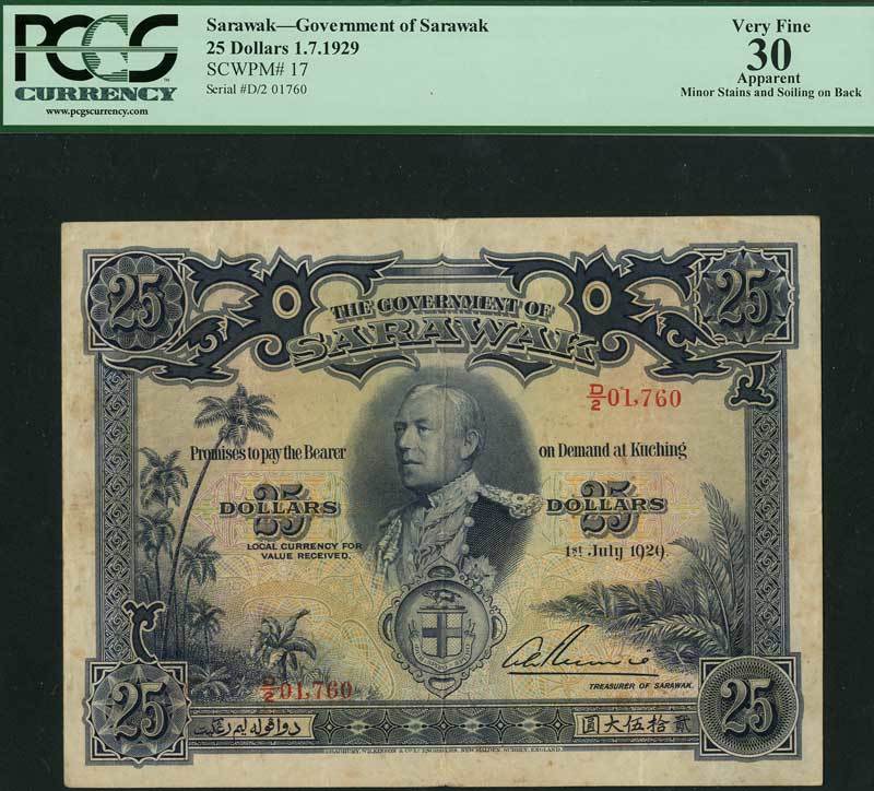 Government of Sarawak, $25, 1 July 1929, serial number D/2 01760, blue and multicoloured, Charles Vyner Brooke and arms at centre, palm trees at left, fronds at right, value at centre and at each corner, signature of Rennie low right, reverse blue, a Government building in Kuching at centre, value low centre